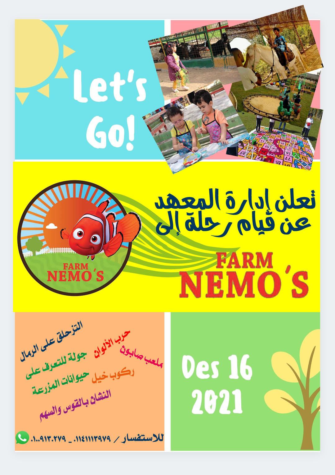 يعلن معهد نور التوحيد الأزهري الخاص عن قيام رحله إلى Nemo's farm